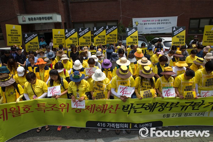 (서울=포커스뉴스) 27일 오후 서울 종로구 청운효자동주민센터 앞에서 416 가족협의회와 416 연대 관계자들이 세월호 특조위 강제해산과 박근혜 정부를 규탄하는 기자회견을 하고 있다.