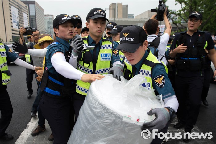 | △ 기자회견에 쓰일 돗자리 압수하는 경찰 |