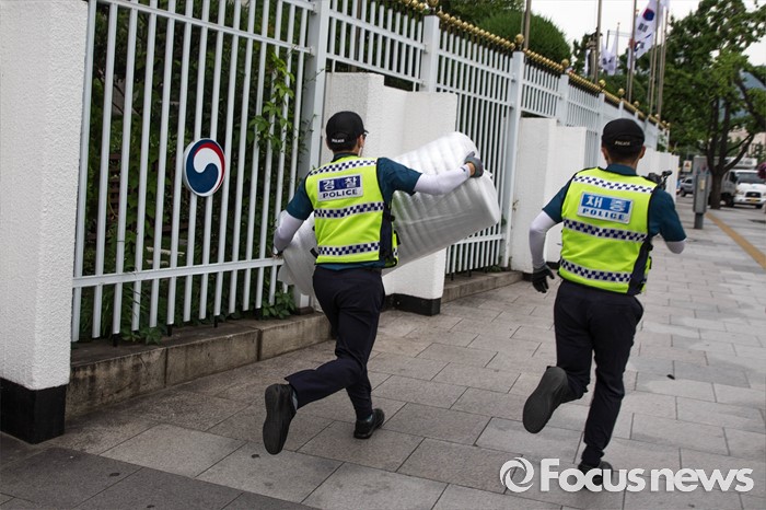 (서울=포커스뉴스) 27일 오후 서울 종로구 정부서울청사 앞에서 경찰 관계자들이 세월호 관계자들의 기자회견에 쓰일 은박 돗자리를 압수, 이를 숨기기 위해 경찰 버스를 향해 뛰어가고 있다.