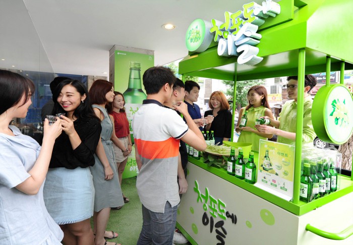 이번 이벤트는 소주 브랜드의 주 마케팅 무대인 주점이나 식당을 벗어나 20~30대 소비자들이 자주 찾는 서울 마포 홍대와 서울 성동 건대 일대의 쇼핑몰과 카페 등에서 '청포도에이슬'을 체험할 수 있는 이색적인 행사다. 다음달 10일까지 매주 금~일요일 3일씩 운영된다.