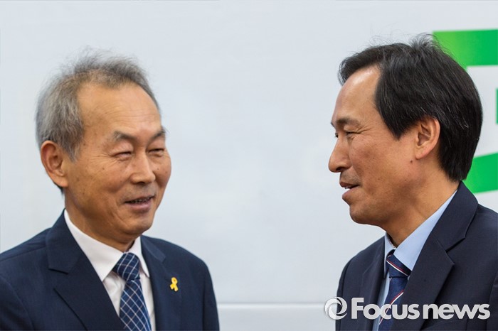 (서울=포커스뉴스) 우상호(오른쪽) 더불어민주당 원내대표가 27일 오후 서울 여의도 국회에서 이석태 세월호특별조사위원회 위원장과 면담에 앞서 인사 하고 있다.