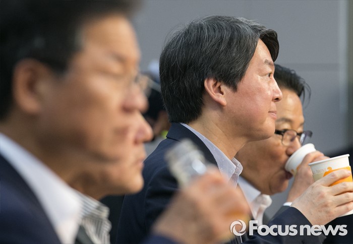 (서울=포커스뉴스) 28일 오전 서울 여의도 국회 의원회관에서 열린 국민의당 20차 정책역량강화 워크숍에 참석한 천정배(왼쪽부터) 공동대표, 안철수 상임공동대표, 박지원 원내대표가 음료를 마시고 있다.