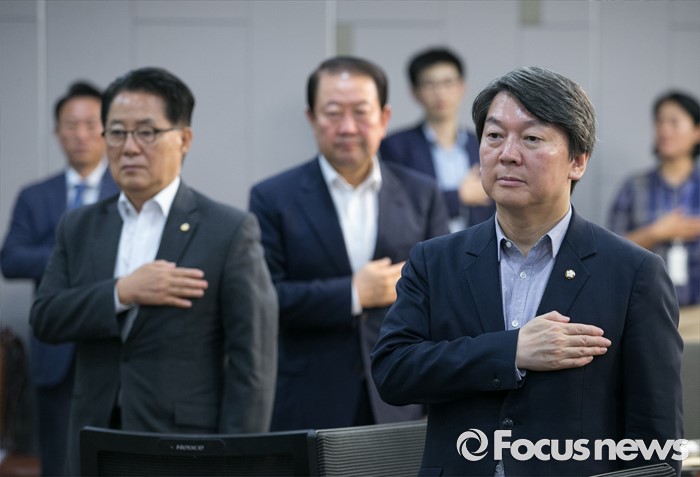 (서울=포커스뉴스) 28일 오전 서울 여의도 국회 의원회관에서 열린 국민의당 20차 정책역량강화 워크숍에 참석한 안철수(오른쪽부터) 상임공동대표, 박주선 국회 부의장, 박지원 원내대표 등 참석자들이 국기에 대한 경례를 하고 있다.