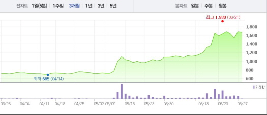 사실 키스톤글로벌은 10일부터 17일까지 6거래일 연속 상승세를 나타내는 등 상승곡선을 그려왔다. 1달 전 주가인 5월27일(1025원)과 비교했을 때 무려 62.9% 상승한 수치다.