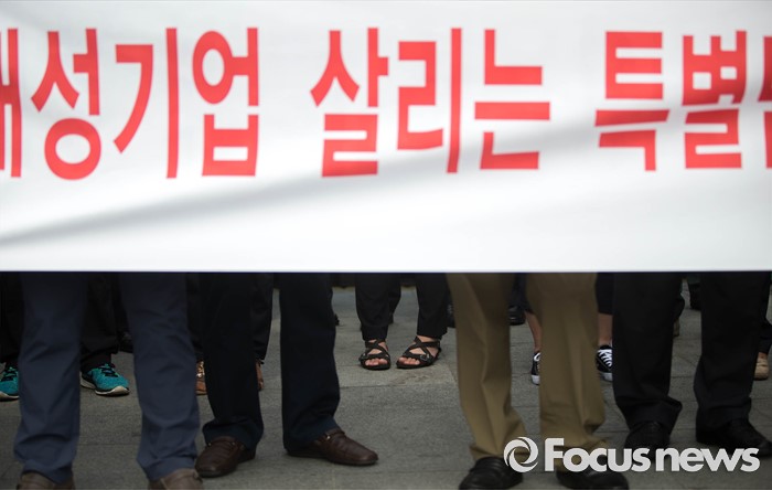 (서울=포커스뉴스) 28일 오전 서울 종로구 정부서울청사 앞에서 개성공단 입주기업 비대위 관계자들이 방북 승인을 촉구하는 집회를 하고 있다.