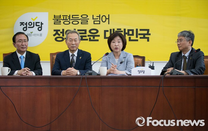 (서울=포커스뉴스) 이석태(왼쪽 두번째) 세월호 특조위 위원장을 만난 자리에서 심상정(오른쪽 두번째) 정의당 대표가 28일 오전 서울 여의도 국회에서 발언하고 있다. 왼쪽 첫번째는 노회찬 원내대표.
