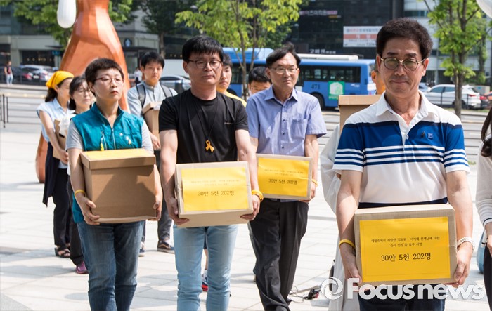 (서울=포커스뉴스) 28일 오전 서울행정법원 앞에서 세월호 희생 기간제교사 순직인정촉구대책위 회원들이 순직 인정 촉구 소송 기자회견을 마친 후 소장과 순직 인정 요구 서명지 상자를 법원에 전달하고 있다.