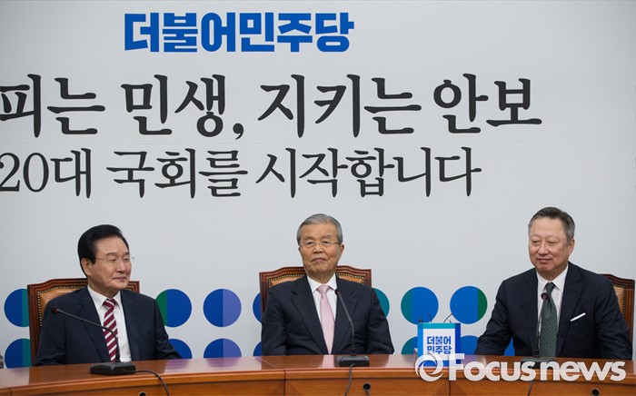 (서울=포커스뉴스) 김종인(가운데) 더불어민주당 비상대책위원회 대표와 변재일 정책위의장이 28일 오전 서울 여의도 국회에서 박용만(오른쪽) 대한상공회의소 회장을 접견하고 있다.