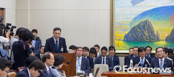 (서울=포커스뉴스) 최완근 국가보훈처 차장이 28일 오전 서울 여의도 국회에서 열린 정무위원회에 참석해 야당 위원들의 퇴장 요구를 받은 박승춘 국가보훈처장을 대신해 업무보고 하고 있다.