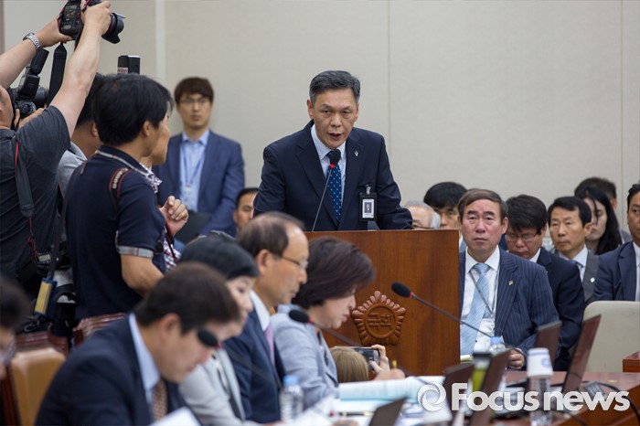 (서울=포커스뉴스) 최완근 국가보훈처 차장이 28일 오전 서울 여의도 국회에서 열린 정무위원회에 참석해 야당 위원들의 퇴장 요구를 받은 박승춘 국가보훈처장을 대신해 업무보고 하고 있다.