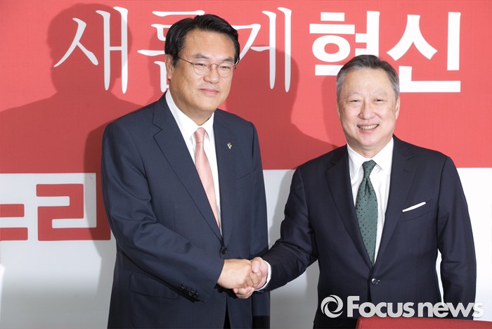 (서울=포커스뉴스) 정진석(왼쪽) 새누리당 원내대표가 28일 오전 서울 여의도 국회를 방문한 박용만 대한상공회의소 회장과 인사하고 있다.