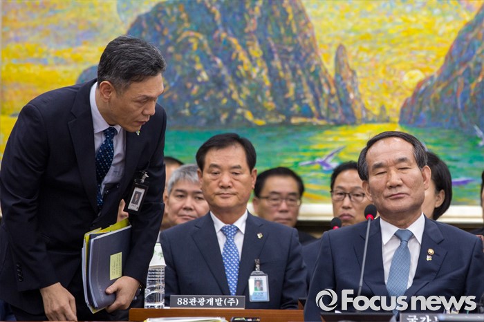 (서울=포커스뉴스) 최완근(왼쪽) 국가보훈처 차장이 28일 오전 서울 여의도 국회에서 열린 정무위원회에 참석해 야당 위원들의 퇴장 요구를 받은 박승춘 국가보훈처장을 대신해 업무보고 지시를 받은 뒤 난감해 하고 있다.