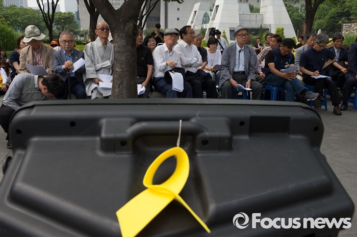 (서울=포커스뉴스) 28일 오전 서울 종로구 정부서울청사 인근 공원에서 열린4.16가족협의회·4.16연대 '세월호 특조위 강제해산에 대응하는 각계 긴급 회의'에 가족협의회 및 시민들이 참석하고 있다.