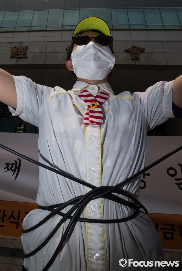 (서울=포커스뉴스) 28일 오전 서울 마포구 한국경영자총연합회 회관 앞에서 알바노조 조합원들이 10년 연속 최저임금 동결을 주장하는 경총 규탄 퍼포먼스를 펼치고 있다.