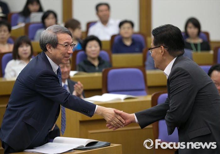 (서울=포커스뉴스) 28일 오전 서울 여의도 국회 의원회관에서 열린 '한국적 제3의 길' 창립 기념 초청 강연, '한국경제와 20대 국회가 가야할 길'에 참석한 정운찬(왼쪽) 동반성장연구소 이사장과 박지원 국민의당 원내대표가 악수하고 있다.