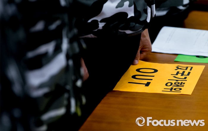 (서울=포커스뉴스) 28일 오전 서울 여의도 국회 헌정기념관에서 열린 '임을 위한 행진곡' 기념곡 지정저지 범국민대책본부 출범식 및 결의대회에 참석한 관련단체 회원 및 참석자들이 애국가를 부르고 있다.