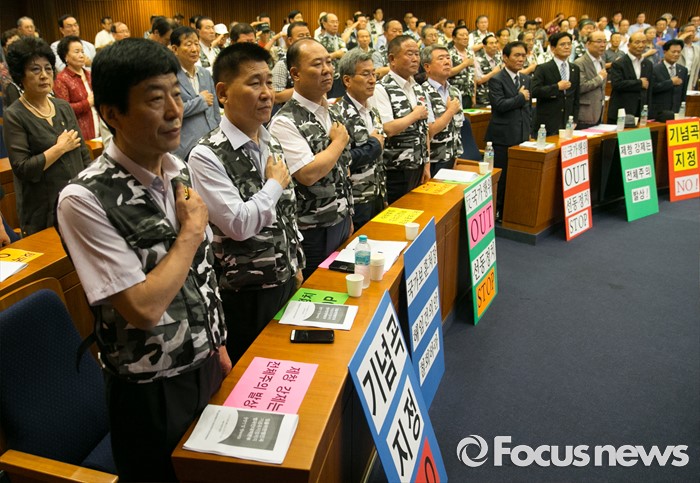 (서울=포커스뉴스) 28일 오전 서울 여의도 국회 헌정기념관에서 열린 '임을 위한 행진곡' 기념곡 지정저지 범국민대책본부 출범식 및 결의대회에 참석한 관련단체 회원 및 참석자들이 국기에 대한 경례를 하고 있다.