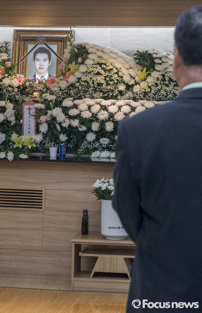 (서울=포커스뉴스) 28일 오후 서울 성동구 한양대학교병원 장례식장에 마련된 故 오세종(34) 전 쇼트트랙 국가대표 선수의 빈소를 찾은 한 조문객이 영정을 바라보고 있다.