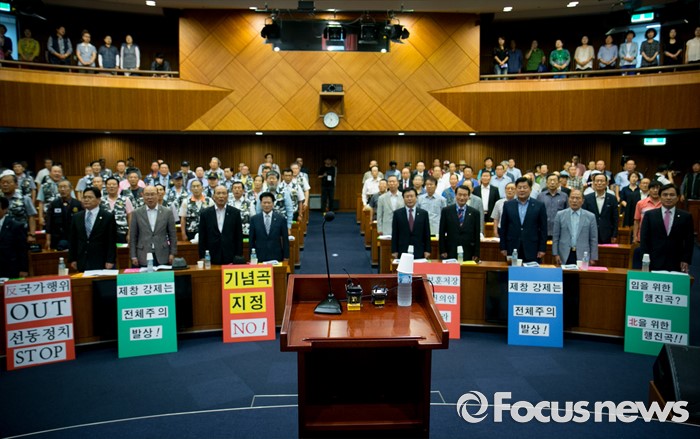 (서울=포커스뉴스) 28일 오전 서울 여의도 국회 헌정기념관에서 열린 '임을 위한 행진곡' 기념곡 지정저지 범국민대책본부 출범식 및 결의대회에 참석한 관련단체 회원 및 참석자들이 애국가를 부르고 있다.