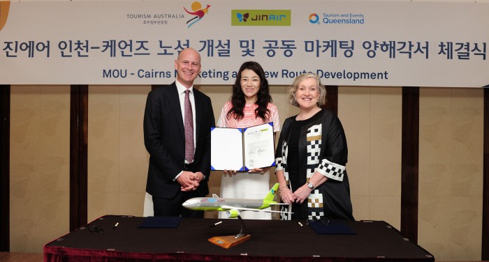 진에어는 28일 오전 서울 중구에 있는 웨스틴 조선호텔에서 호주 정부 관광청·퀸즈랜드주 관광청과 인천~케언즈 노선 개설 및 공동 마케팅을 위한 양해각서(MOU)를 체결했다고 밝혔다.