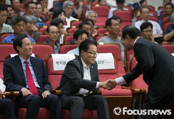 (서울=포커스뉴스) 28일 오후 서울 여의도 국회 의원회관에서 열린 20대 국회가 꼭 해야 할 농업개혁 과제 정책토론회에 참석한 박지원(가운데) 국민의당 원내대표와 노회찬(오른쪽) 정의당 원내대표가 인사하고 있다. 왼쪽은 우상호 더불어민주당 원내대표.