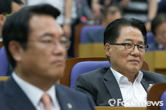 (서울=포커스뉴스) 28일 오후 서울 여의도 국회 의원회관에서 열린 4차 산업혁명포럼 창립총회에 참석한 정진석(왼쪽) 새누리당 원내대표, 박지원 국민의당 원내대표가 자리하고 있다. 이날 창립한 포럼은 여야 3당 비례대표 1번인 송희경 새누리당 의원, 박경미 더불어민주당 의원, 신용현 국민의당 의원을 주축으로 구성된 포럼이다.