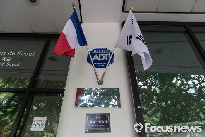(서울=포커스뉴스) 28일 오후 서울 서초구 서울프랑스학교에서 '파리식 길 표지판 공개 행사'가 끝나고 양국 국기가 걸려있다.