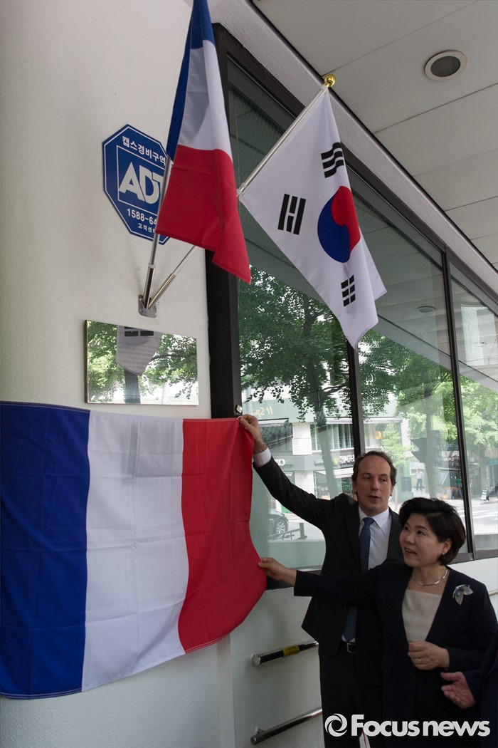 (서울=포커스뉴스) 28일 오후 서울 서초구 서울프랑스학교에서 파비앙 페논(오른쪽 두 번째) 주한 프랑스 대사와 조은희 서초구청장이 '파리식 길 표지판 공개 행사'에 참석해 표지판 제막을 하고 있다.