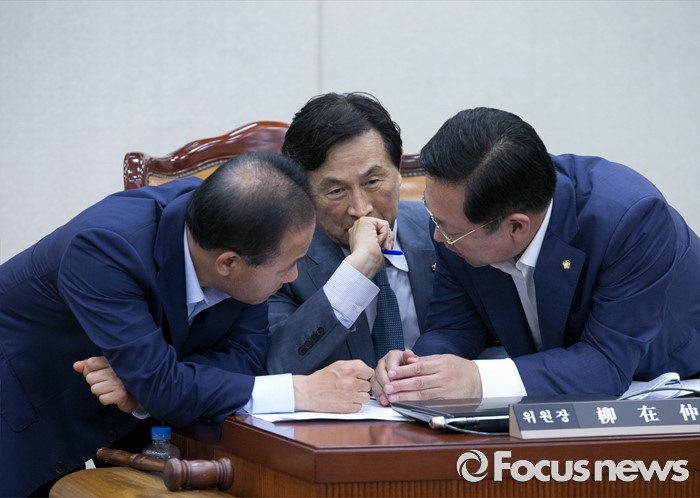 (서울=포커스뉴스) 28일 오후 서울 여의도 국회에서 열린 안전행정위원회 전체회의에 참석한 유재중(가운데) 위원장과 윤재옥(왼쪽) 새누리당 간사, 박남춘 더불어민주당 간사가 대화하고 있다.