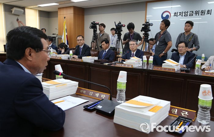 (세종=포커스뉴스) 박준성 최저임금위원회 위원장이 28일 오후 세종시 정부세종청사 고용노동부 최저임금위원회 전원히의실에서 열린 최저임금위원회 제7차 전원회의에서 김제락 위원의 발연을 듣고 있다.