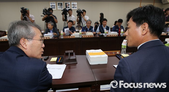 (세종=포커스뉴스) 박준성(왼쪽) 최저임금위원회 위원장이 28일 오후 세종시 정부세종청사 고용노동부 최저임금위원회 전원히의실에서 열린 최저임금위원회 제7차 전원회의에서 류경희 부위원장과 대화하고 있다.