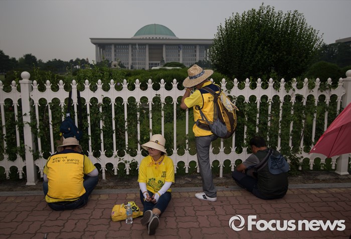 (서울=포커스뉴스) 세월호 참사 유가족들이 28일 오후 서울 여의도 국회 앞에서 20대 국회 6월 임시국회에 특별법 개정을 촉구하는 기자회견을 가졌다. 기자회견 장소를 벗어난 유가족 및 회견 참석자들이 국회 울타리 앞을 서성이고 있다.