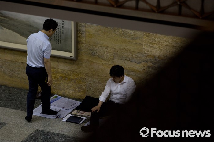 (서울=포커스뉴스) 28일 오후 서울 여의도 국회에서 상임위원회에 업무 지원을 나선 관계기관 공무원들이 전체회의가 열리는 회의실 밖을 지키며 업무를 보고 있다.