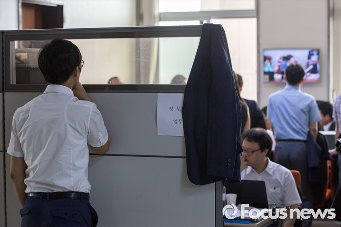 (서울=포커스뉴스) 28일 오후 서울 여의도 국회에서 상임위원회에 업무 지원을 나선 관계기관 공무원들이 전체회의가 열리는 회의실 밖을 지키며 업무를 보고 있다.