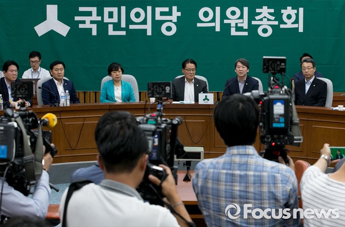 (서울=포커스뉴스) 28일 오후 서울 여의도 국회에서 리베이트 의혹에 연루된 박선숙, 김수민 의원과 왕주현 전 사무부총장 징계수위 등 논의를 위한 국민의당 의원총회를 마친 안철수(오른쪽 두번째) 상임공동대표가 회의 결과에 대한 브리핑을 하고 있다.