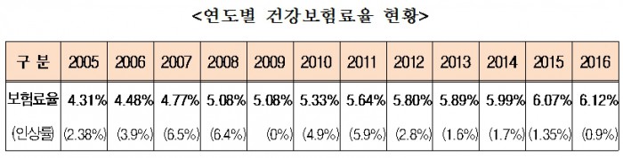(서울=포커스뉴스) 내년 건강보험료가 올해 수준으로 동결됐다. 이에 따라 직장가입자는 보수월액의 6.12%(본인·사용자가 반씩 분담)로 월평균 보험료 9만5485원(2016년 3월 본인부담액 기준), 지역가입자는 월평균 보험료 8만8895원을 내게 된다.