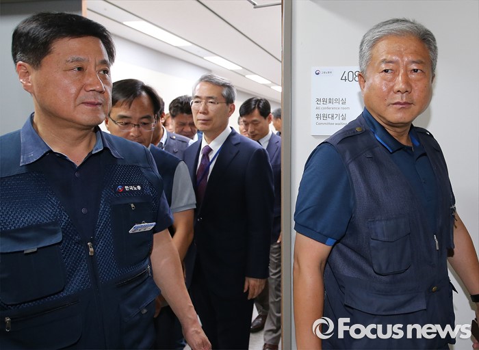 (세종=포커스뉴스) 28일 오후 세종시 정부세종청사 고용노동부 최저임금위원회 전원회의실에서 열린 제7차 전원회의가 정회돼, 김동만 한국노총 위원장이 전원회의실을 방문, 박준성 최저임금위원회 위원장과 대화를 마치고 회의실을 나서고 있다.