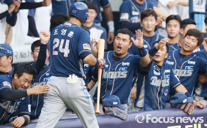 (서울=포커스뉴스) 28일 서울 잠실구장에서 열린 2016 프로야구 NC-두산 경기 2회초 NC 선두타자 조영훈이 두산 투수 니퍼트의 초구를 떄려 우월 솔로 홈런을 치고 덕아웃에서 동료들의 환영을 받고 있다.