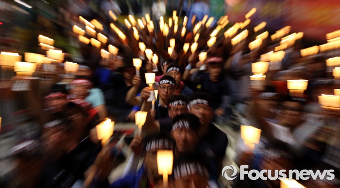 (세종=포커스뉴스) NH 농협중앙회노동조합원들이 28일 오후 세종시 정부세종청사 농림축산식품부 앞에서 농협법 개정 반대하는 1박 2일 노숙집회에서 촛불을 들고 있다.