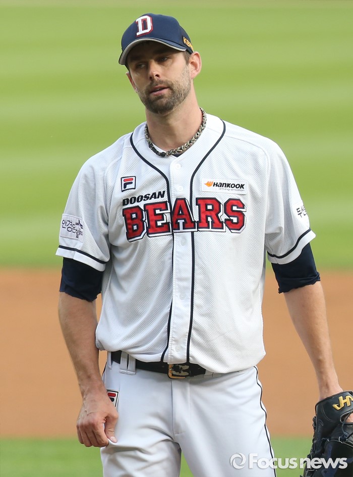 (서울=포커스뉴스) 28일 서울 잠실구장에서 열린 2016 프로야구 NC-두산 경기에서 1회초 두산 선발투수 니퍼트가 NC 선두타자 이종욱을 볼넷으로 내보내며 아쉬워하고 있다.