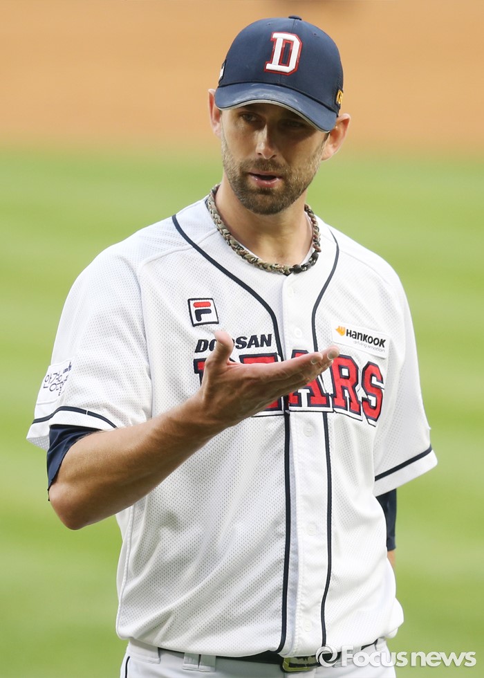 (서울=포커스뉴스) 28일 서울 잠실구장에서 열린 2016 프로야구 NC-두산 경기에서 두산 투수 니퍼트가 3회 수비를 마치고 덕아웃으로 들어가며 포수 양의지와 자신의 투구에 대해 대화하고 있다.