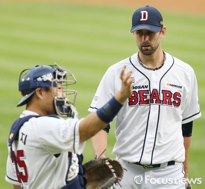 (서울=포커스뉴스) 28일 서울 잠실구장에서 열린 2016 프로야구 NC-두산 경기에서 두산 투수 니퍼트와 포수 양의지가 3회 수비를 마치고 덕아웃으로 들어가며 투구에 대해 대화하고 있다.
