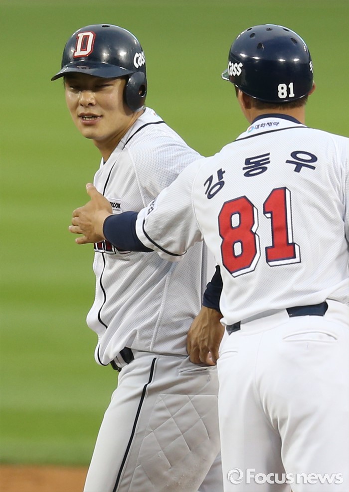 (서울=포커스뉴스) 28일 서울 잠실구장에서 열린 2016 프로야구 NC-두산 경기 4회말 무사 1,3루에서 두산 민병헌이 동점 좌중간 2루타를 치고 강동우 코치의 축하를 받고 있다.
