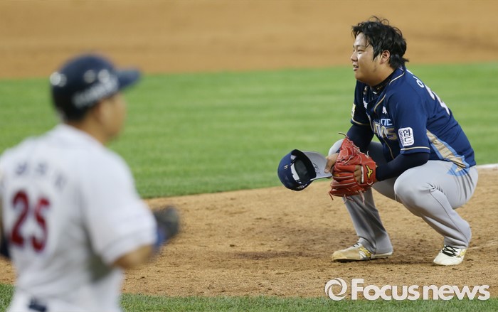 (서울=포커스뉴스) 28일 서울 잠실구장에서 열린 2016 프로야구 NC-두산 경기 4회말 무사 1,2루에서 NC 투수 이민호가 두산 양의지에게 볼넷을 내주고 마운드에 쭈그려 앉아 아쉬워하고 있다.