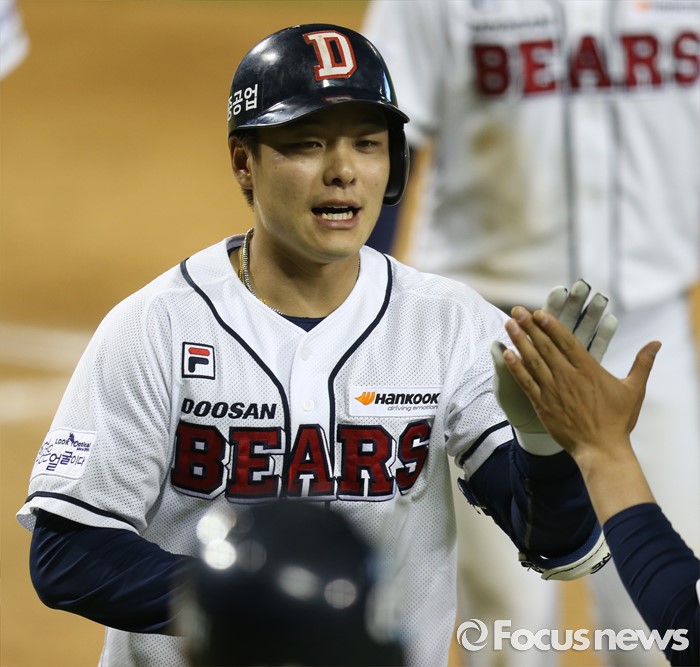 (서울=포커스뉴스) 28일 서울 잠실구장에서 열린 2016 프로야구 NC-두산 경기 7회말 2사 1,2루에서 두산 민병헌이 좌월 3점 홈런을 치고 홈인하고 있다.