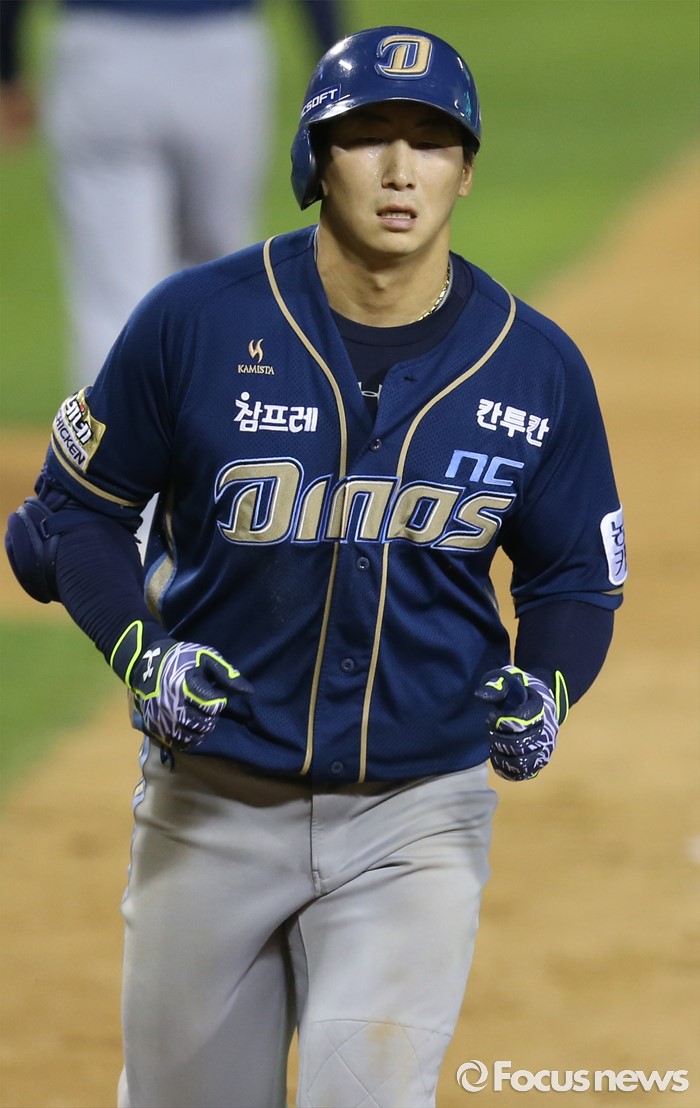 (서울=포커스뉴스) 28일 서울 잠실구장에서 열린 2016 프로야구 NC-두산 경기 7회초 2사후 NC 나성범이 우중간 솔로 홈런을 치고 홈인하고 있다.