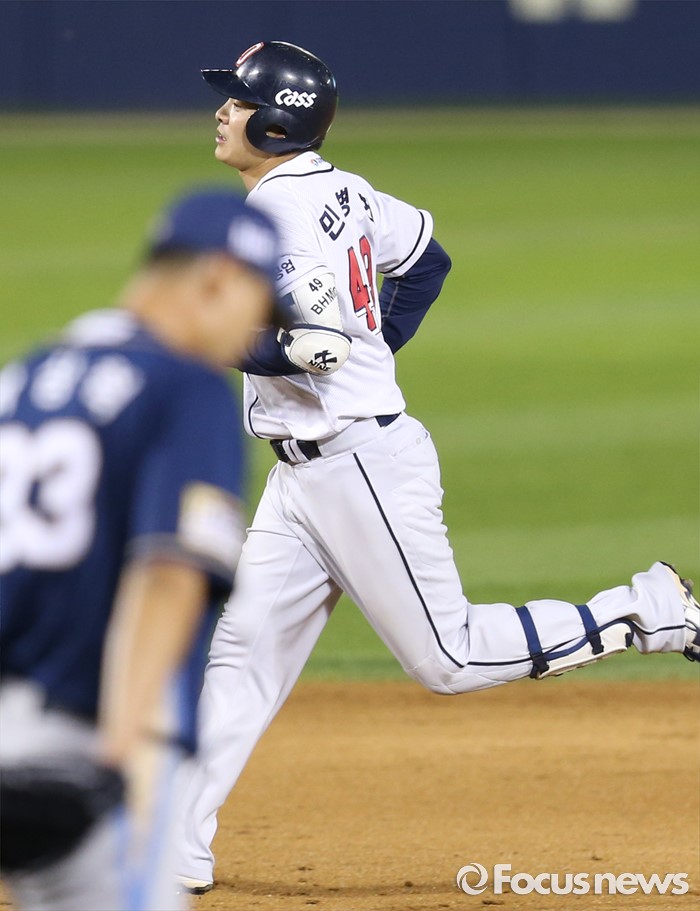 (서울=포커스뉴스) 28일 서울 잠실구장에서 열린 2016 프로야구 NC-두산 경기 7회말 2사 1,2루에서 두산 민병헌이 좌월 3점 홈런을 치고 그라운드를 달리고 있다.