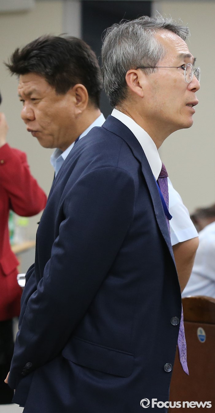 (세종=포커스뉴스) 최저임금 결정 법정 시한인 28일 저녁 세종시 정부세종청사 고용노동부 최저임금위원회 전원회의실에서 열린 전원회의 중 정회가 선언된 가운데 대화하는 박준성 위원장 뒤로 노동계 위원이 지나고 있다.
