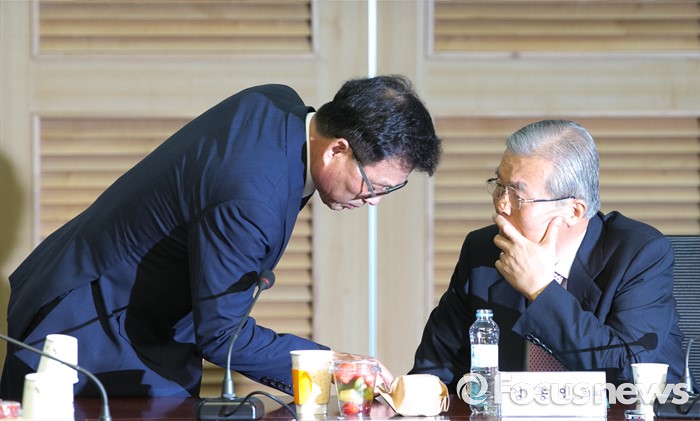 (서울=포커스뉴스) 29일 오전 서울 여의도 국회 의원회관에서 열린 아젠다 2050 창립총회에 참석한 김종인(오른쪽) 더불어민주당 비대위 대표와 박광온 의원이 대화하고 있다.