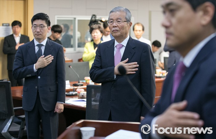 (서울=포커스뉴스) 29일 오전 서울 여의도 국회 의원회관에서 열린 아젠다 2050 창립총회에 참석한 김세연(왼쪽부터) 새누리당 의원, 김종인 더불어민주당 비대위 대표, 오신환 새누리당 의원 등 의원들이 국기에 대한 경례를 하고 있다.